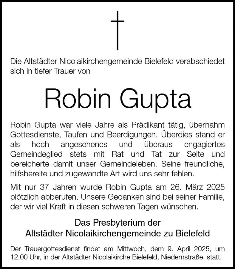 Robin Gupta ist plötzlich und unerwartet aus dem Team Altstädter Nicolaikirche durch Tod herausgerissen worden.